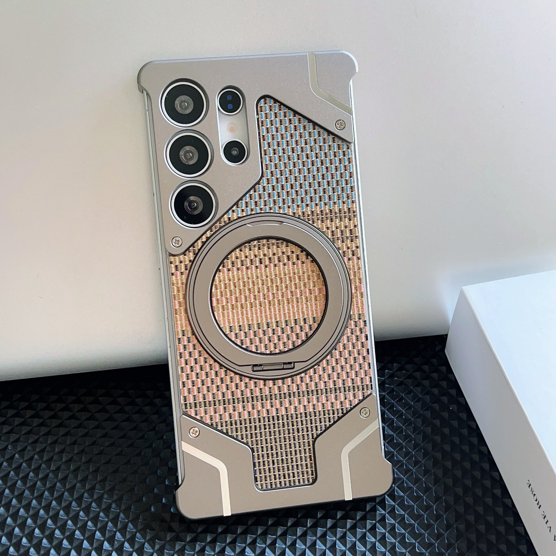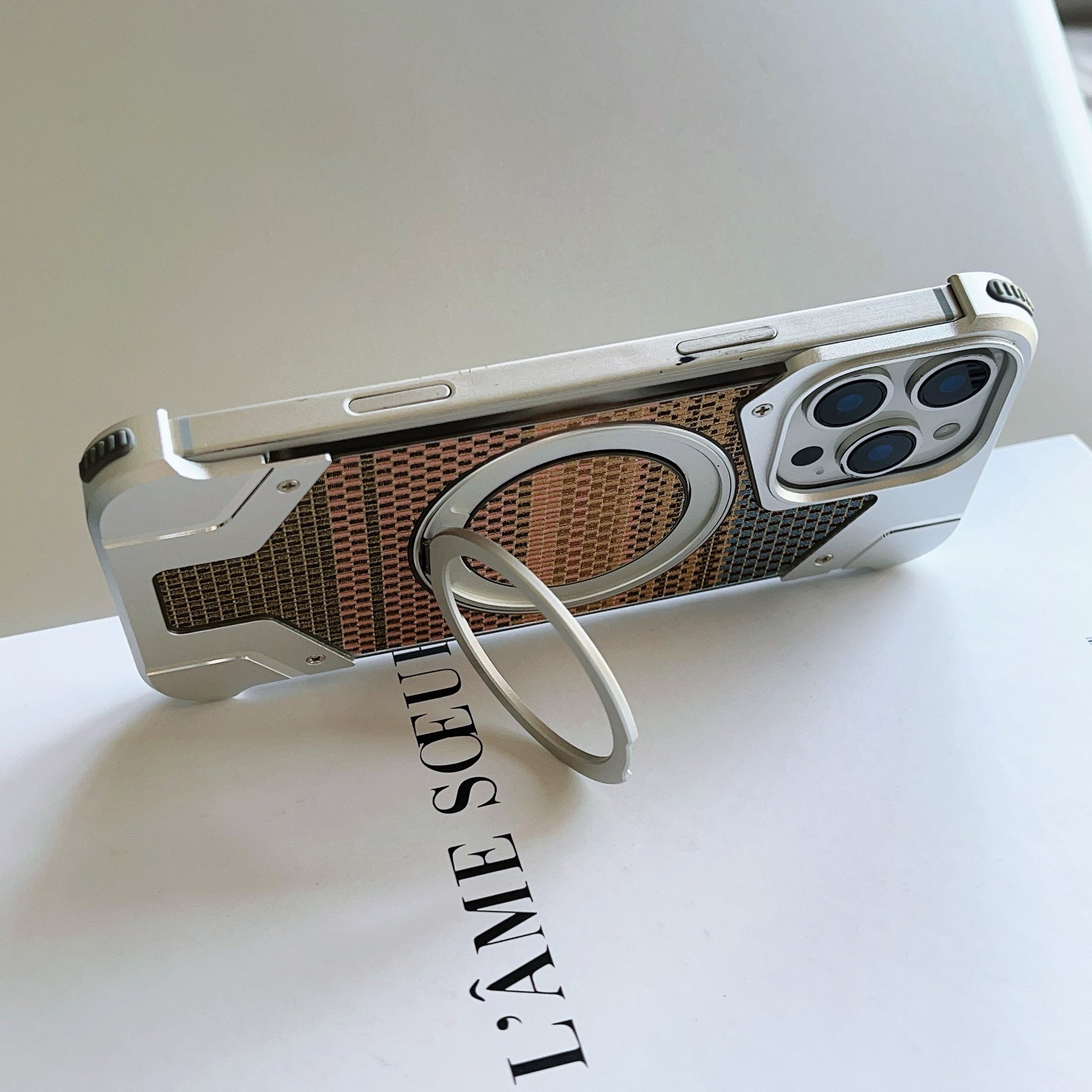 Armor King Bezel-less Armature MagSafe Pivot Ring Stand Armature Golden Silk Silver Brocade Metal Case Cover